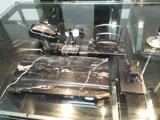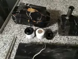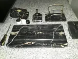 Bureauset / bureauset van marmer. De set bestaat uit een plank (hier kan de inktpot geplaatst en vastgemaakt worden), inktpot met 2 tweedelige porseleinen inzetstukken, gumwip, briefopener, brieven- of posthouderbakje en losse pennenhouder (verplaatsbare pennenhouder). stevig en behoorlijk zwaar. De conditie is goed met minimale ouderdomssporen. De set komt uit de familie - mijn grootvader heeft hem zijn hele leven gebruikt, dus ik denk dat hij uit de jaren dertig komt.