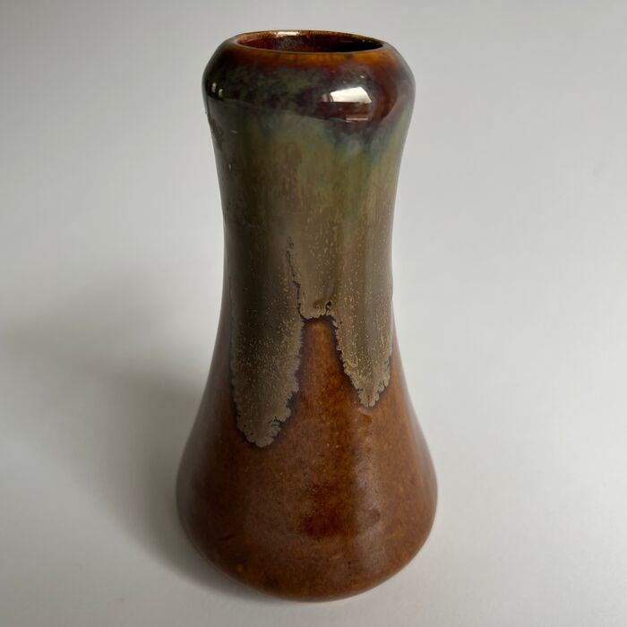 Art nouveau keramiek solifleur vaasje met stroomglazuur van aardewerkfabriek Bürgel BKW (Bürgeler Keramischen Werkstätten, in Thüringen Duitsland). Het handgemaakte vaasje is ontworpen voor BKW ontworpen door keramist en kunstenaar Carl Fischer (1891-1969) en is vervaardigd in de periode 1920-1930.