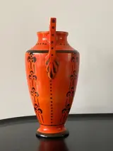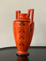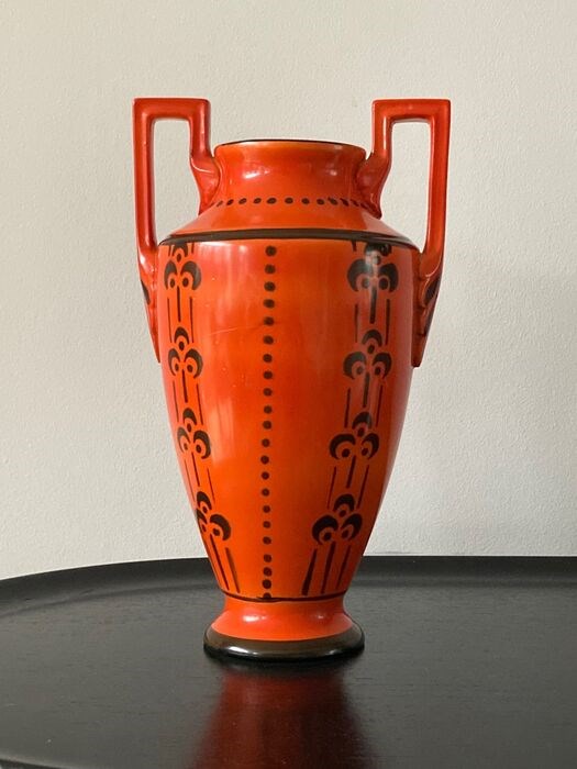 Prachtige, grote en zeldzame art deco amfoor vaas model 822 van Boch Frères Keramis La Louviere. Een ontwerp van de beroemde keramist Charles Catteau. Mooi geometrisch floraal decor en geweldig diep warme kleur oranje. Een echte eyecatcher. Voorzien van blindstempel met modelnummer.