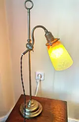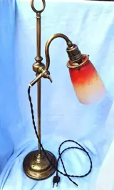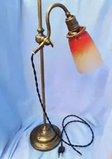Prachtige messing tafellamp met C.Schneider Tulipe glas en gesigneerd "L.D." BTE S.G.D.G Frans patent.* Historische oude tafellamp met veel patina en oude stopcontactschakelaar.