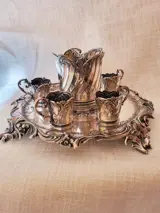 De set is in goede staat, het dienblad heeft een diameter van 25 cm, de flessenhouder heeft een hoogte van 7,5 cm terwijl de glashouders een hoogte hebben van ongeveer 4 cm.