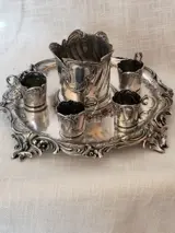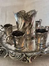 Waardevolle likeurset bestaande uit een dienblad, 4 glazen houders en 1 flessenhouder in metaal geperforeerd Gallia.