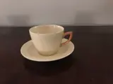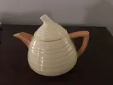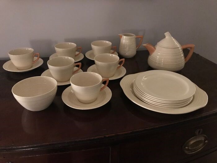 Een compleet fraai Art Deco Theeservies van de beroemde Engelse ontwerpster Clarice Cliff. De set bestaat uit 16 stuks. Een Theepot, Suikerpot, Melkkannetje, 6 Kop en schotels, 6 borden ( breed 16,5 cm ) en 1 Cake serveerschaal ( 25 cm ).
