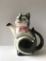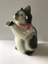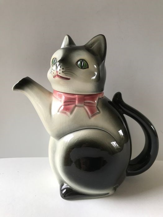 Zeer fraaie oude theekan in de vorm van een zwart-witte kat.