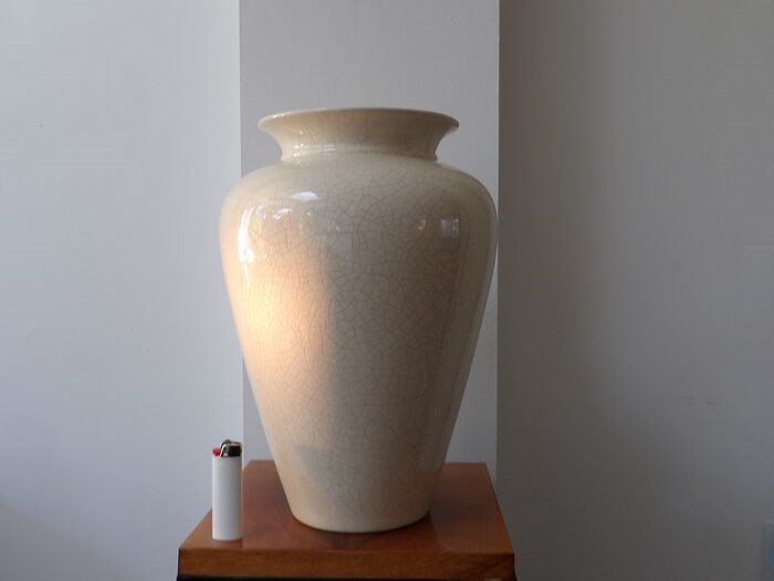 Gave Zeer grote Franse Art Deco Vaas, craquele plateel, Frankrijk 30-er jaren, kleur ivoorkleurig, gesigneerd D.Deres, Hoogte maar liefst 36cm, doorsnede 27cm, gewicht 3,5kg, mooie grote gave Vaas.