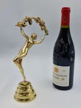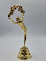 Sierlijke 3-D dansende vrouw met druivenrank in haar handen. De vrouw staat op een sokkel.