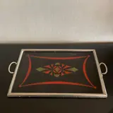 Het dienblad heeft een aluminium omlijsting en handgrepen.