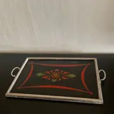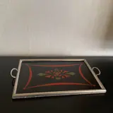 De afbeelding onder de glazen plaat is zwart, door de tijd heen enigszins gecraqueleerd, met rood/groene decoratie.