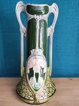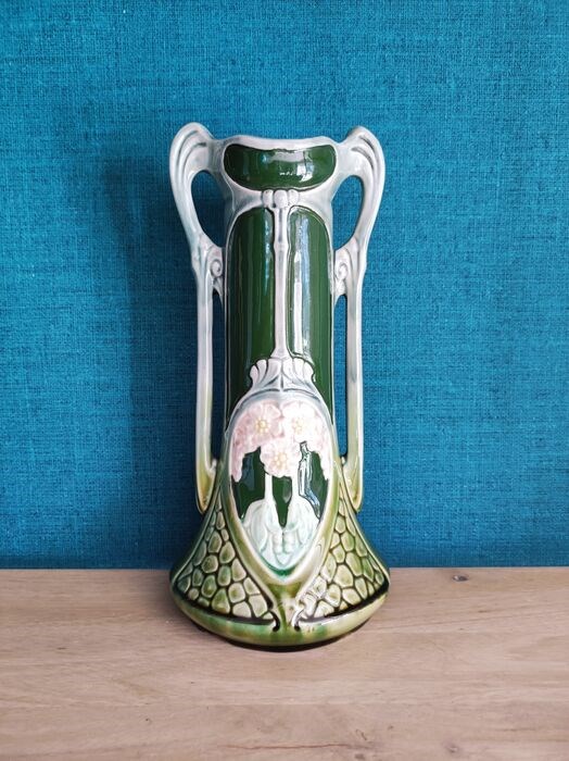 Grote art nouveau vaas met bohemian keramiek handgrepen.