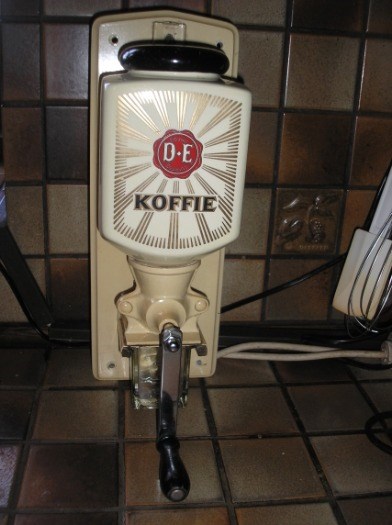 Douwe egberts wandkoffiemolen met glazen opvangbakje.- Kan grof of fijn malen- in prima staat.- Prijs 52,50