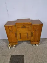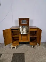 Middenboven een openslaande klep met daar onder ruimte voor glazen en kleine flessen .