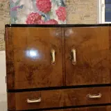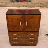 Bijzonder, elegant, handig dressoir in notenhout met twee deuren en drie lades, ebonisatie omtrek, interieur in esdoorn, voorkant aan de zijkanten verzacht met afgeronde hoeken, vintage handgrepen, onlangs volledig opnieuw gepolijst