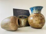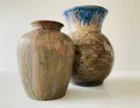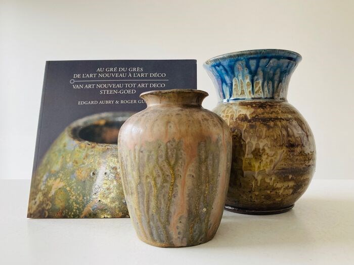 Twee zoutgeglazuurde Bouffioulx-vazen van de befaamde familie Aubry: vaasje van meester-potier Edgard Aubry (1880-1943) (16 cm ) in het gezelschap van een buikvaas (22 cm) van zoon Marcellus Aubry (1909-1982). Toegevoegd is het rijk geïllustreerde referentiewerk over de kunst Edgard Aubry en Roger Guérin van Pignolet et al., Au Gré du Grès, de l'Art Nouveau à l'Art Déco, Roger Guérin et Edgard Aubry, 2007. De vazen zijn gemerkt en in uitstekende staat; de vaas van Marcellus heeft wel een productiefoutje/vlek op de buik (zie foto’s).