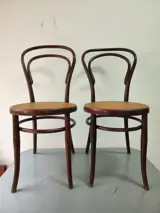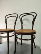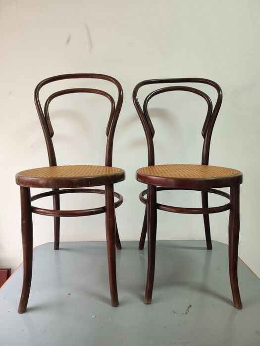 J&J Kohn 20e eeuwse Thonet stijl stoelen. Stoelen vervaardigd door Jacob & Josef Kohn (J & J Kohn, vader Jacob en zoon Josef) rond 1900 de grootste concurrent van Thonet. Het bureau werkte samen met de ontwerpers van de Wiener Werkstätte (onder andere Josef Hoffmann en Koloman Moser). Gemerkt onder de zitting met een papieren label: "Jacob & Josef Kohn, Wien".