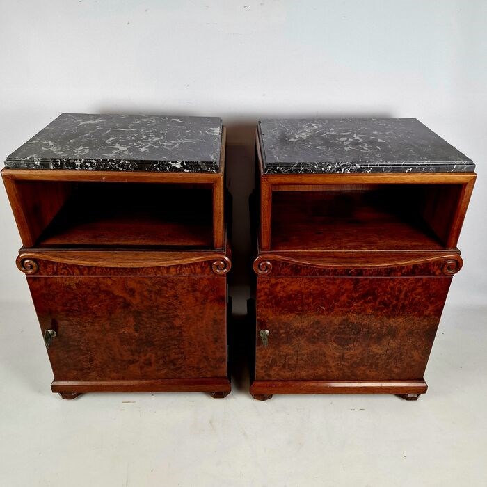 Prachtig uniek en zeldzaam koppel bijzet kasten met zwart marmeren bovenblad, afgewerkt met een in ijzer gelakte binnen afwerking in de kast.