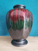 Vaas in typische art deco vorm met rood en zwart glazuur met donkergroene tinten.
