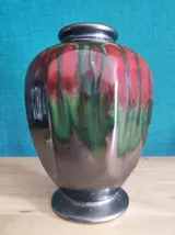 Vaas in typische art deco vorm met rood en zwart glazuur met donkergroene tinten.