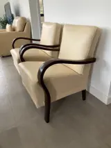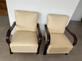 Twee pas gerenoveerde art deco fauteuils met premium Italiaans leer in ivoorkleur. Binnenconstructie is ook vast.