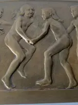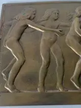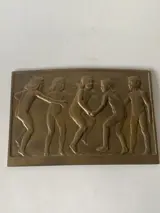 Bronzen plaquette van Felix Pfeifer (1871-1954), voorstellende naakte dansende meisje en 1 jongentje in Relief.