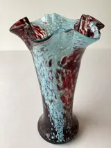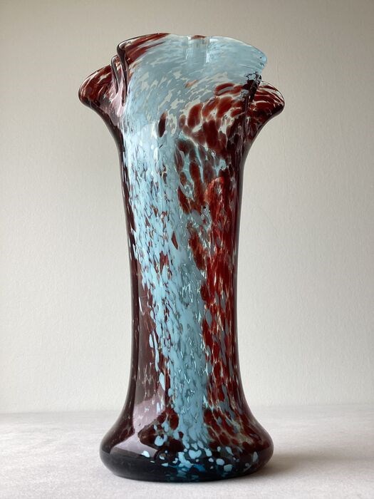 Prachtige grote Art Nouveau Clichy vaas met mooie intens blauw en bordeaux gemouchteerd kleurenspel.