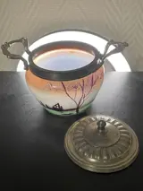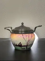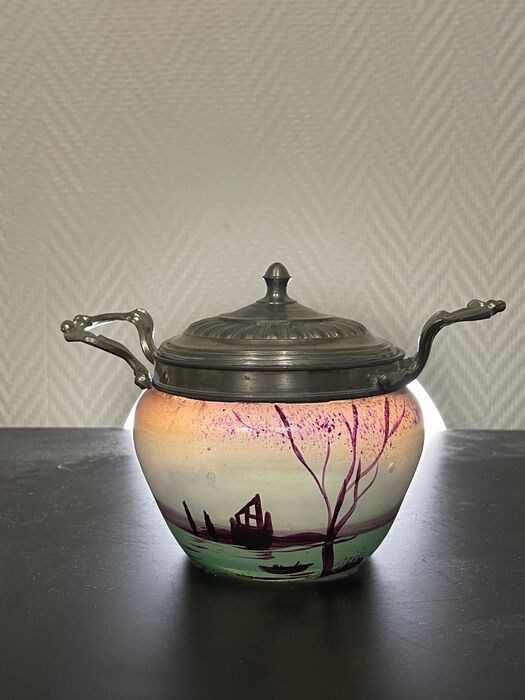 Prachtig klein suikerpotje of koekjespotje van François Théodore Legras in Art Nouveau geëmailleerd glas.