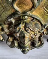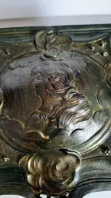 Juwelendoos met in reliëf gemaakte buste van een dame op het bovenste gedeelte en bloemen- en plantendecoratie, en nog een buste van een dame op het onderste gedeelte, afgeronde en golvende vormen, het interieur bekleed met blauwe zijden gewatteerde kleding, het heeft de sleutel dat hoewel het is van deze doos sluit niet goed.