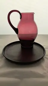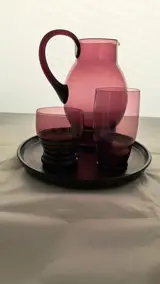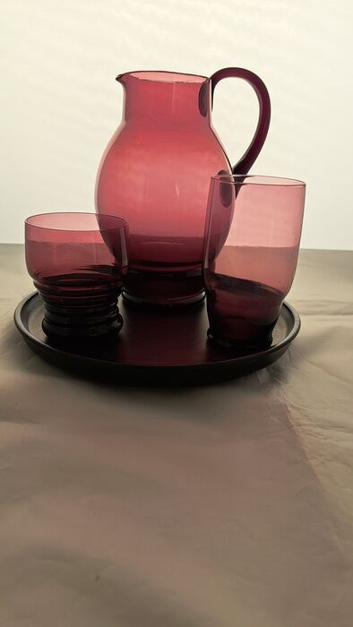 Een puntgaaf waterstel bestaande uit een waterkan met bijpassend glas en bijbehorend onderblad. Het stel is ontworpen door de bekende ontwerper A.D Copier voor glas-atelier Leerdam rond 1936-1937. Daarbij een glas van een ander door Copier ontworpen waterstel. De kan en 2 glazen zijn ongemerkt en de onderschotel is gemerkt met het etsmerk CL aan de onderkant. De schotel heeft gebruikerssporen maar is niet beschadigd. Bekijk de foto's goed om teleurstelling te voorkomen!
