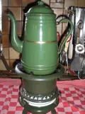 Groen emaille petroleumstel- met lont - 22,50-------------------------petroleumstel met groene koffiepot - - compleetmet lont - koffiepot = lek - 32,50---------ook aanwezig: 3 pits groen emaille petroleumstel 50,-