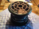 -- e.v. met koffiepot van foto 2 = lek - 30,--------------------------- 3 pits groen emaillepetroleumstel , - met onderplaat