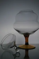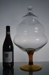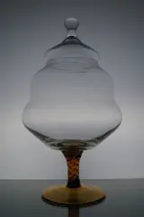 Mooie Art Deco snoepdoos uit de jaren 1930. Bokaal en deksel in helder transparant glas op gedraaide amberkleurige voet.