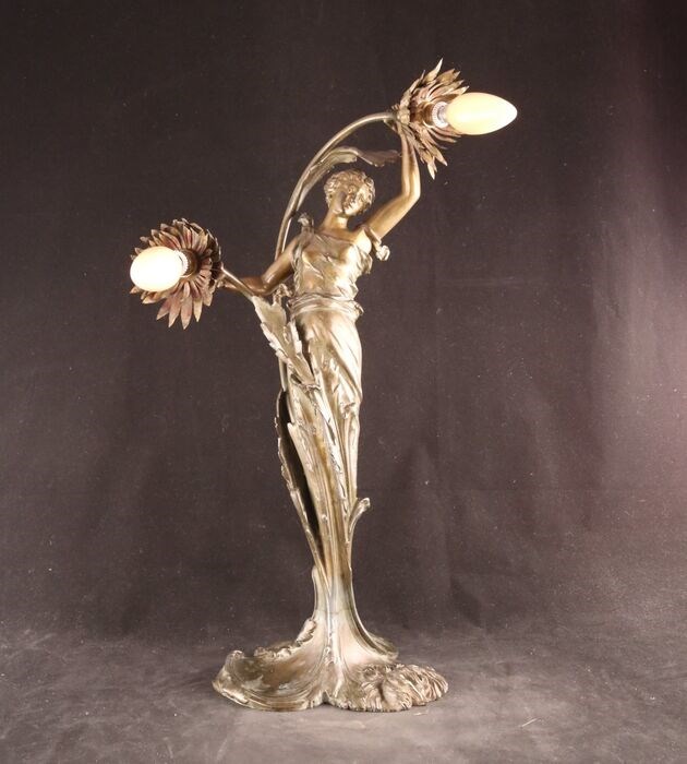 Bijzonder fraaie antieke van composietmetaal gemaakte sculpturale tafellamp in de vorm van een sierlijke dame.