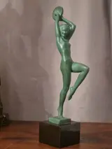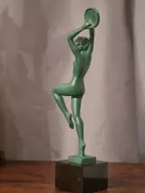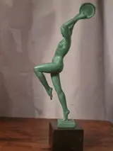 Tamboerijn danseres, sculptuur in spelter op zwart marmer met groene patina voorstellende een naakte vrouw die tamboerijn speelt
