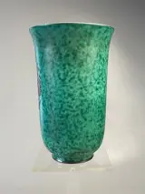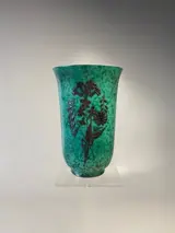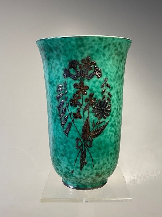 Groene keramieken vaas ingelegd met zilver in Art Deco stijl