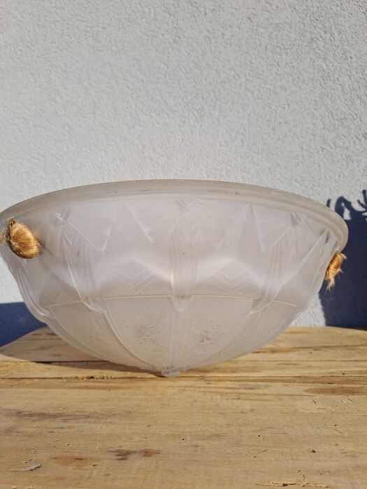 Zeer mooie waskom in dik gegoten persglas, Frans werk van voor de oorlog. Het is in een goede staat van instandhouding, enkele discrete microchips. Wastafel verkocht met kettingsysteem.