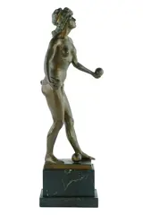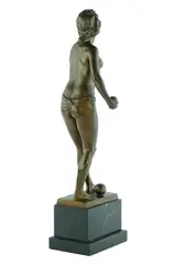 Een fraai en groot bronzen sculptuur voorstellende een vrouwelijk naakt dat met kogels speelt.