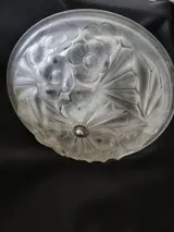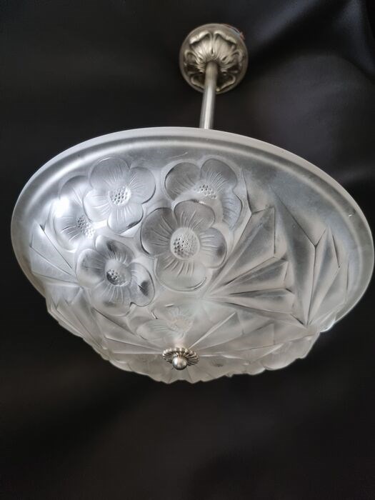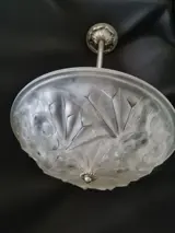 Schitterende pendellamp van Hubens. Hubensliet in opdracht glaswerk maken bij Degue. De lamp is gesigneerd met Hubens maar ook,wat bijzonder is, met Degue op de rand,zie foto's. Dit model komt ook voor met alleen de Degue signatuur.