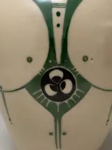 Met het kenmerkende glansdecor van medaillons in groen en oker op een wit/gele ondergrond. Deze stukken zijn te dateren tussen 1915 en 1918.