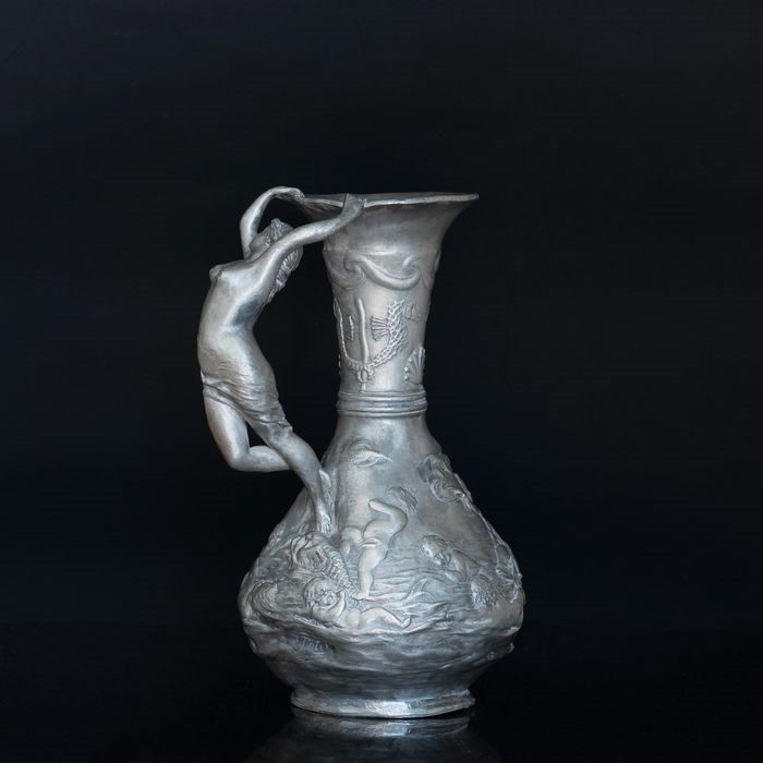 Zeer mooie kruik in Pétiz tin. Het stelt een decor voor van spelende putti en rijdende dolfijnen op een zeebodem. Sommigen van hen worden gedragen door het schuim en verlicht door een vuurtoren. Ter hoogte van de nek worden vier zeepaardjes gescheiden door schelpen en bedekt met schuim. De greep heeft de vorm van een gedrapeerde nimf. Dit prachtige object is in uitstekende staat en gesigneerd door de kunstenaar Jean Maurice Petizon (1855-1922) beter bekend als PETIZ. Kunstenaar werkzaam rond 1900. Hij staat bekend om de kwaliteit van zijn vazen en in het bijzonder om dit unieke exemplaar. We vinden deze kunstenaar terug in de oeuvrecatalogus van de verzamelaar Philippe Dahhan “Tinnen 1900 tweehonderd beeldhouwers van de Belle Epoque” 432 p. Het is hol gesigneerd aan de basis. Dit zeer mooie object zal een verzamelaar bekoren. De verzending wordt verzekerd en aangetekend verzonden. Goede deals.