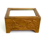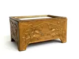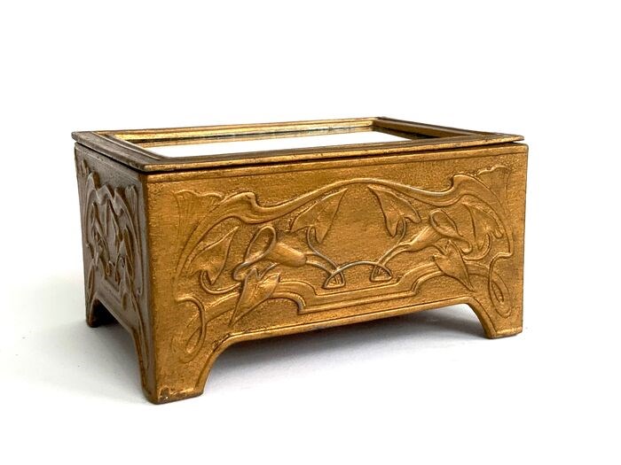 Een metaal verguld juwelendoosje met gestileerde motieven rondom.