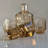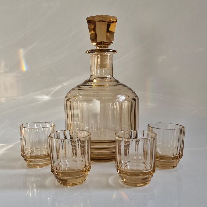 Boheemse/Tsjechische art deco kristallen karaf en 4 borrelglaasjes. Het is in zeer goede staat en van zeer hoge kwaliteit. Handgemaakt en met de hand gesneden in de jaren 1930. Dit is een prachtige 12-zijdige karaf met een rokerige topaas tint. De fles is erg zwaar, passend bij de kwaliteit van Moser. De dop heeft een strakke sluiting. Op de karaf en de stop staat hetzelfde nummer 18. Er zijn kleine sporen van impact op de dop, maar de algemene integriteit is behouden. De set is niet gemerkt.