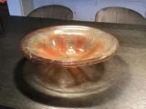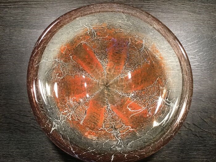 WMF Ikora schaal (?) van Karl Wiedmann. Interessante grote glazen schaal in oranje en bruine tinten. Zwaar en zeer decoratief.