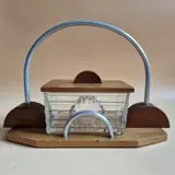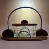 Biscuit/snoeppot op houten, aluminium en persglazen blad in Art Deco stijl.
