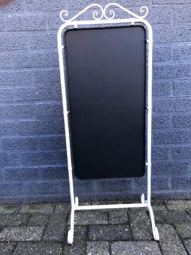 Tekstbord dubbelzijdig, geschikt voor krijt: circa hoog 70 x 35 breed.