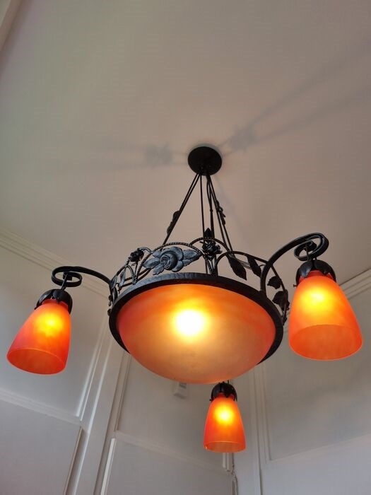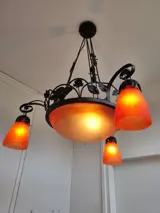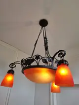Zeer fraaie en imposante chandelier uitgevoerdin een prachtig rode kleur.De chandelier heeft een hoogte van 69cm en een diameter van60cm. Voor uw gemak heb ik de oude bajonet fittings vervangen voor Europese E14 fittings en het oude stroomdraad is ook vervangen.