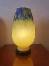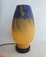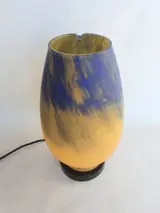 Deze lamp is van geblazen meerlagig glas, in twee verschillende kleuren, oranjegeel en blauw, hij is ondertekend door het oude merk Vianne, glaswerk gevestigd in het departement Lot-et-Garonne in Frankrijk;