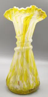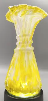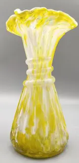 Prachtige oude vaas van geblazen glas met warm bewerkte golvende hals, kleurloze, licht parelachtige achtergrond, gespikkeld met mooie intense kleuren genaamd "zonnig geel" met kleine insluitsels van wit opaal gecombineerd met een serpentijn die de omtrek van de vaas omsluit in de geest van een caduceus.