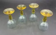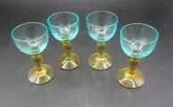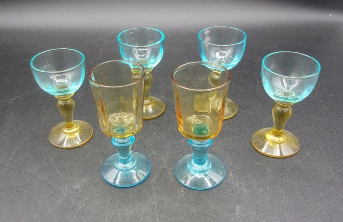 Uiterst zeldzame en schitterende set van 4 kristallen wijnglazen in de kleur geel en blauw met gondelpoot Model Chantilly en 2 kristallen glazen Pompadour model in dezelfde tinten