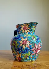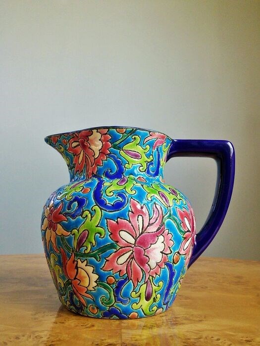Met een polychroom geëmailleerd reliëfdecor van spiralen en florale motieven