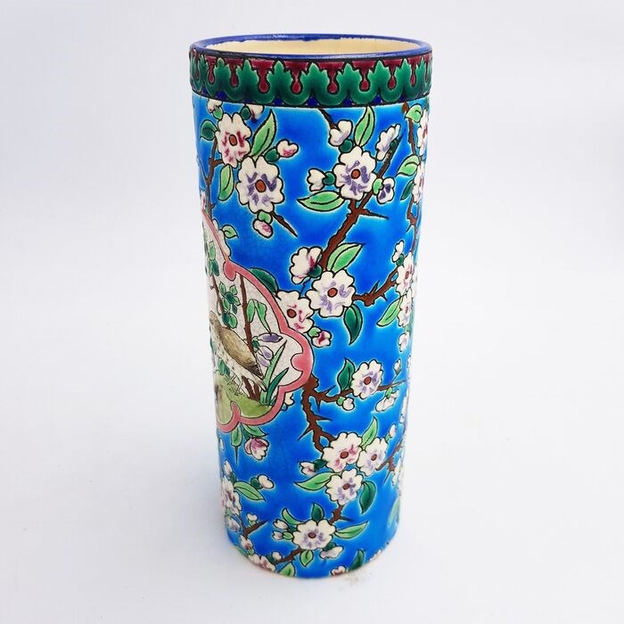 Prachtige polychroom aardewerk (faience) vaas van het bekende Franse fabrikaat Longwy (opgericht in 1798), met zijn bekende cloisonné emaille.