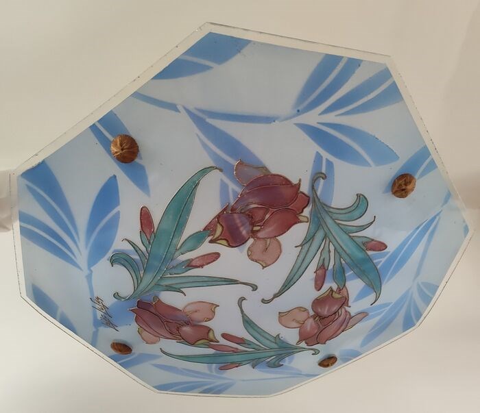 Franse art deco kroonluchter 1930 in geëmailleerd glas vervaardigd door de beroemde glasblazer Loys Lucha.